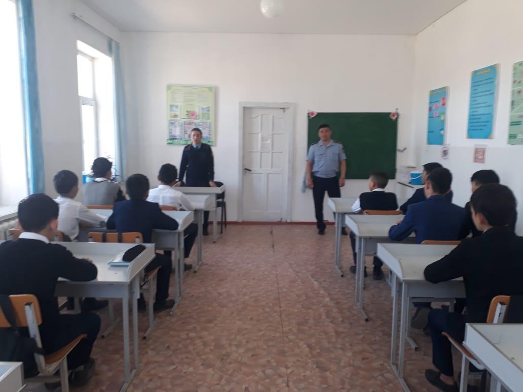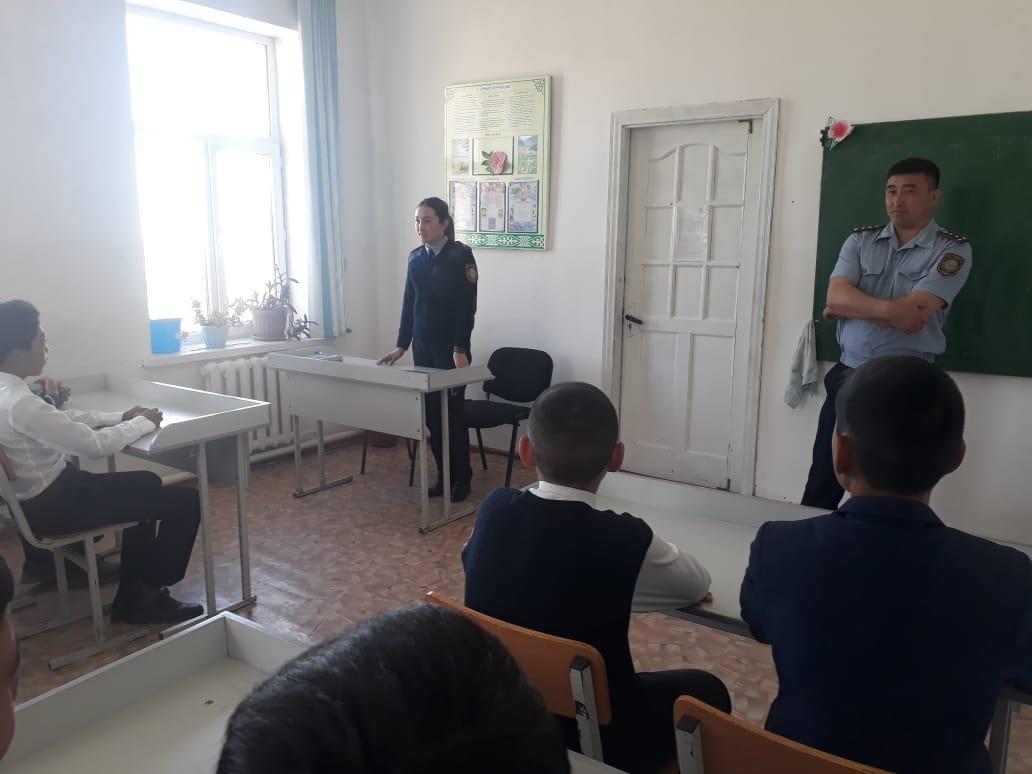 5-10 сыныптар арасында АҚСУ АПБ ЮПТ инспекторы полиция аға лейтенанты Н.Мамырбекова мен ауылдық учаскелік полиция лейтенанты М.Т.Алдабергеновпен "Қылмыссыз балалық шақ " атты тақырыпта кездесу өтті.