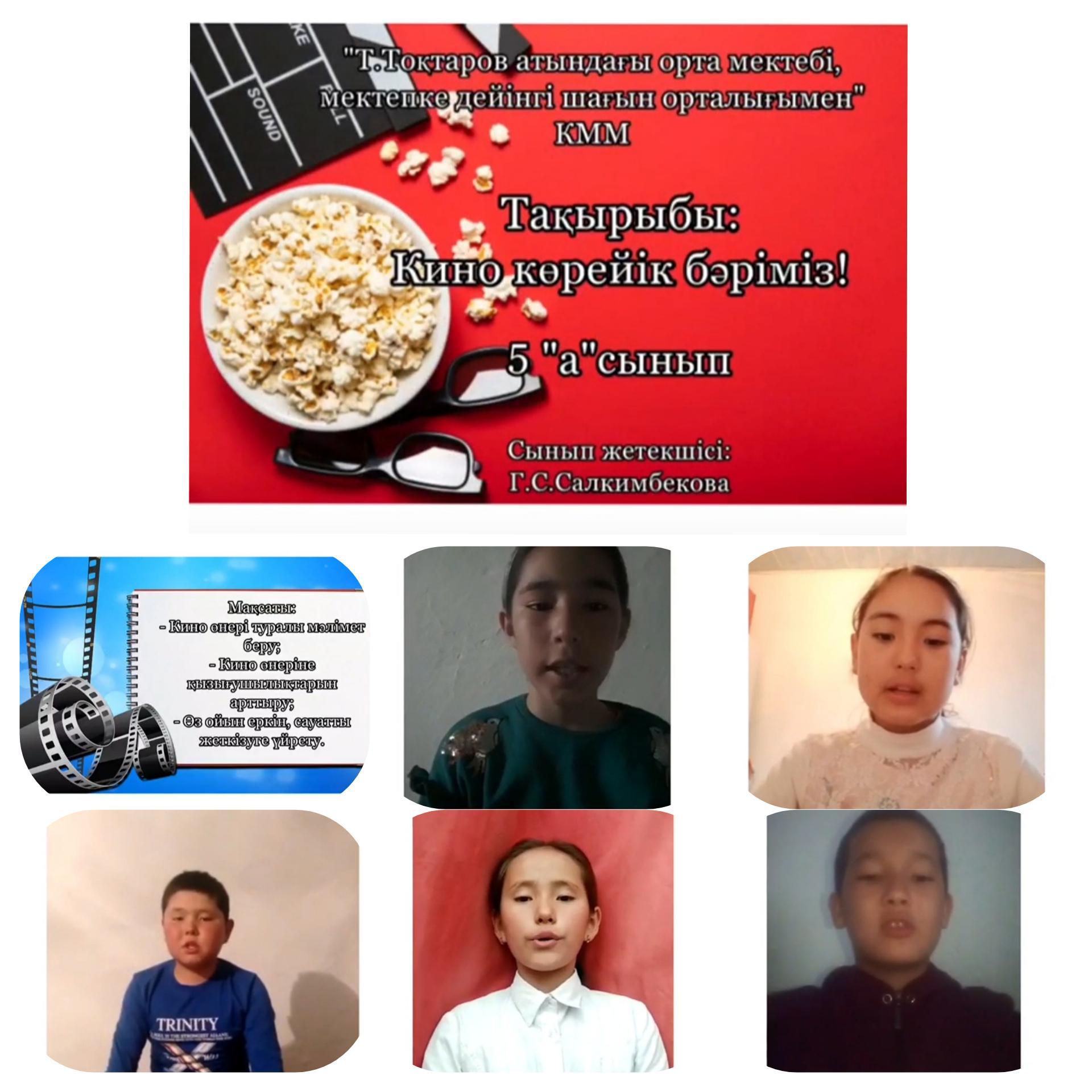 5а -сынып оқушылары кино өнері туралы мәлімет алу, кино өнеріне қызығушылықтарын арттыру мақсатында "Кино көрейік бәріміз!" тақырыбында Қазақстандық режиссерлардың танымдық фильмдеріне талдау жасады. Сынып жетекшісі Салкимбекова Г.С.