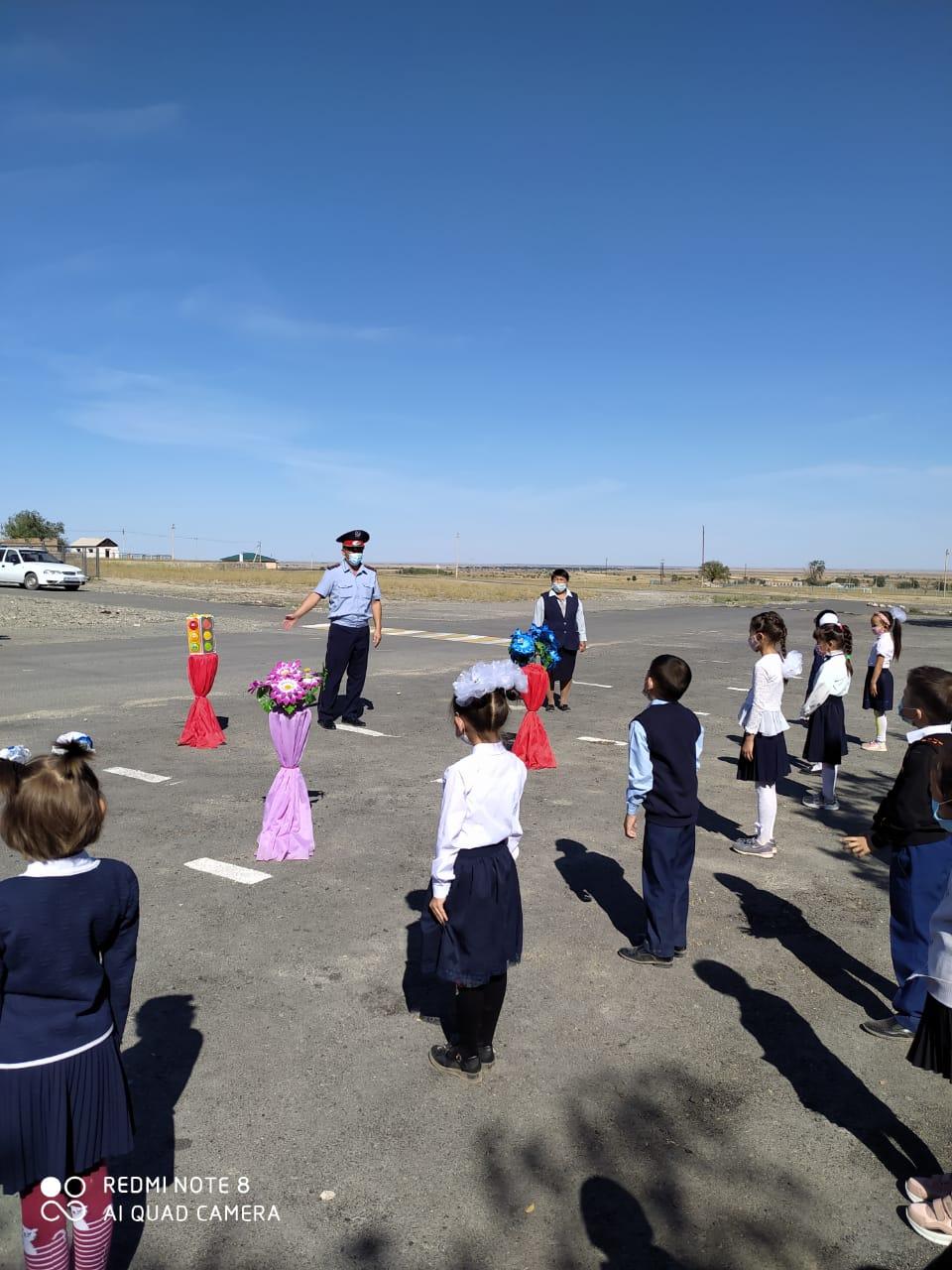 Жол жүру ережесіне байланысты бастауыш сынып оқушыларымен тәрбие сағаттары, полиция қызметкерімен кездесу өтті, видеороликтері жасалды. Мақсаты: Оқушыларды жол қауіпсіздік ережелерімен таныстыру. » 1. 'Т.Тоқтаров атындағы орта мектебі, мектепке дейінгі шағын орталығымен' коммуналдық мемлекеттік мекемесі
