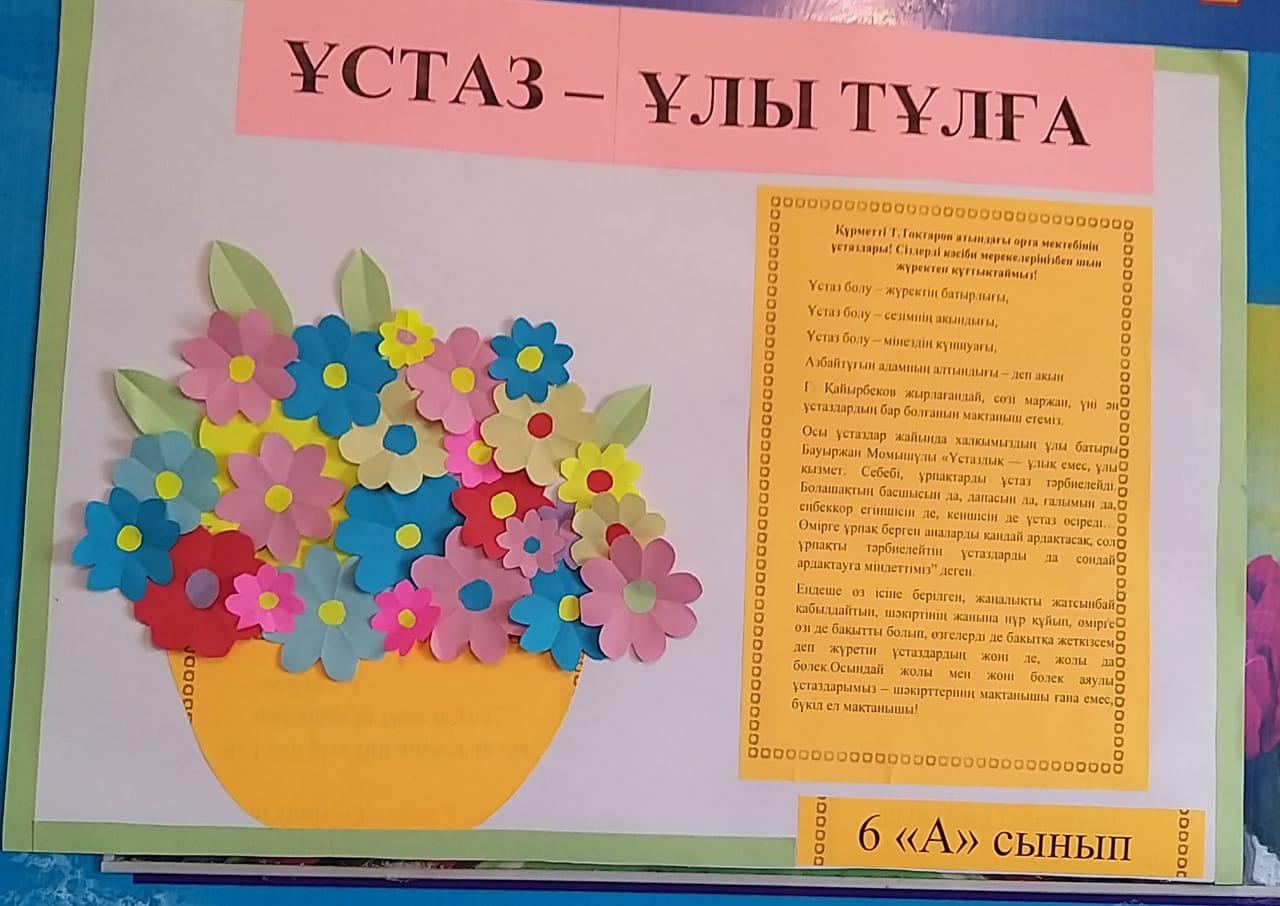 «Ұстаздық етпес жалықпас үйретуден балаға» - деген ұлы Абай бабамыз. "Ұстаздары күніне" арналған мектепішілік қабырға газеттері ілініп, құттықтау видеороликтері салынды, » 1. 'Т.Тоқтаров атындағы орта мектебі, мектепке дейінгі шағын орталығымен' коммуналдық мемлекеттік мекемесі