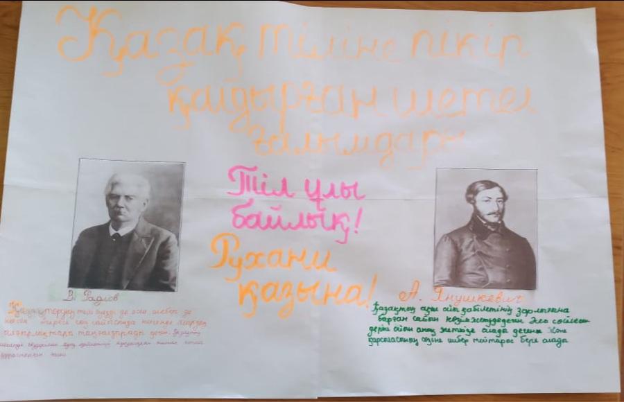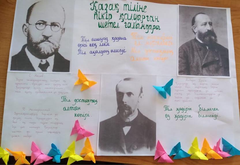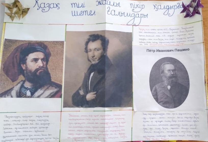 10 сынып оқушыларының "Тіл - құндылық" тақырыбында қабырға газеттері және бейнеролигі. Мақсаты: Шетел ғалымдарының қазақ тілі жайлы пікір білдіргені жөнінде постер қорғау. Пән мұғалімі: Елубаева М.А.