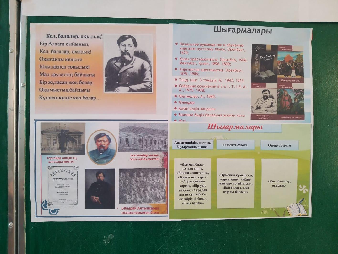 Ыбырай Алтынсариннің 180 жылдығына орай "Кел, балалар оқылық" тақырыбында педагог-ұыйымдастырушы төменгі сынып оқушыларымен тәрбие сағатын өтсе, жоғарғы сынып оқушыларымен дөңгелек үстел ұйымдастырды. » 1. 'Т.Тоқтаров атындағы орта мектебі, мектепке дейінгі шағын орталығымен' коммуналдық мемлекеттік мекемесі