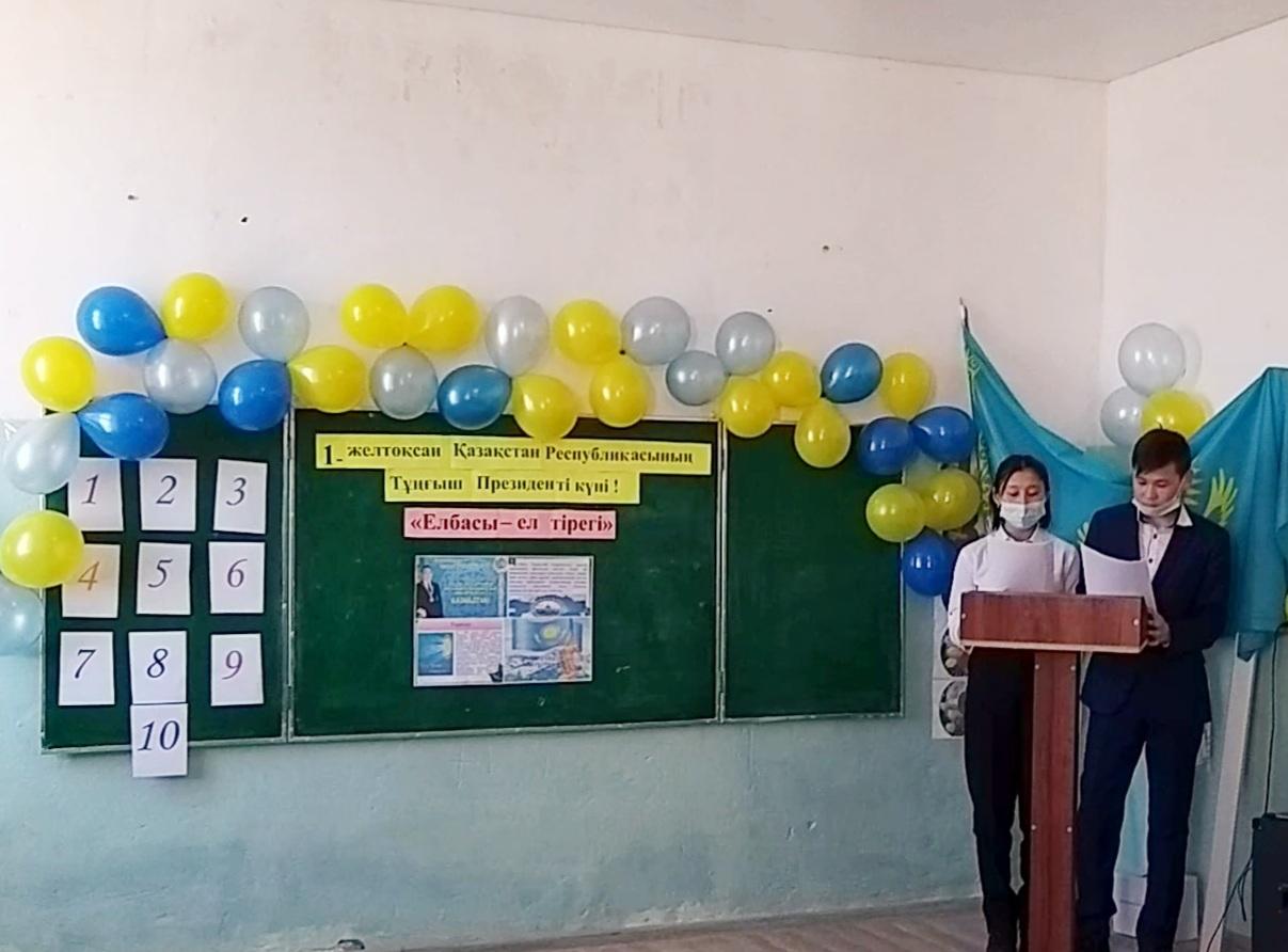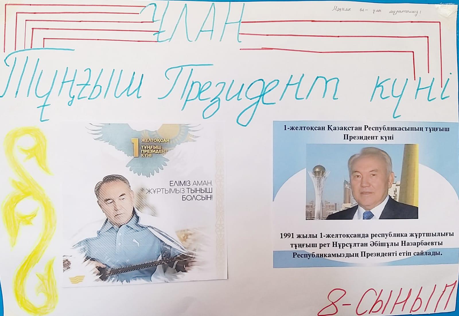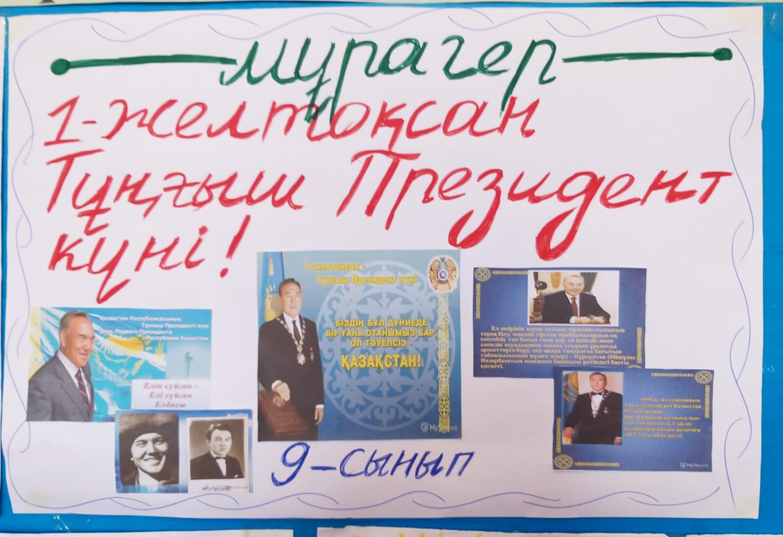 1 желтоқсан ҚР Тұңғыш Президенті күніне "Ел басы - ел тірегі" атты мерекелік концерт ұйымдастырылды және қабырға газеттері ілінді. Елбасының ерен еңбегін мақтаныш сезіммен оқушылар бойына сіңіру. » 1. 'Т.Тоқтаров атындағы орта мектебі, мектепке дейінгі шағын орталығымен' коммуналдық мемлекеттік мекемесі
