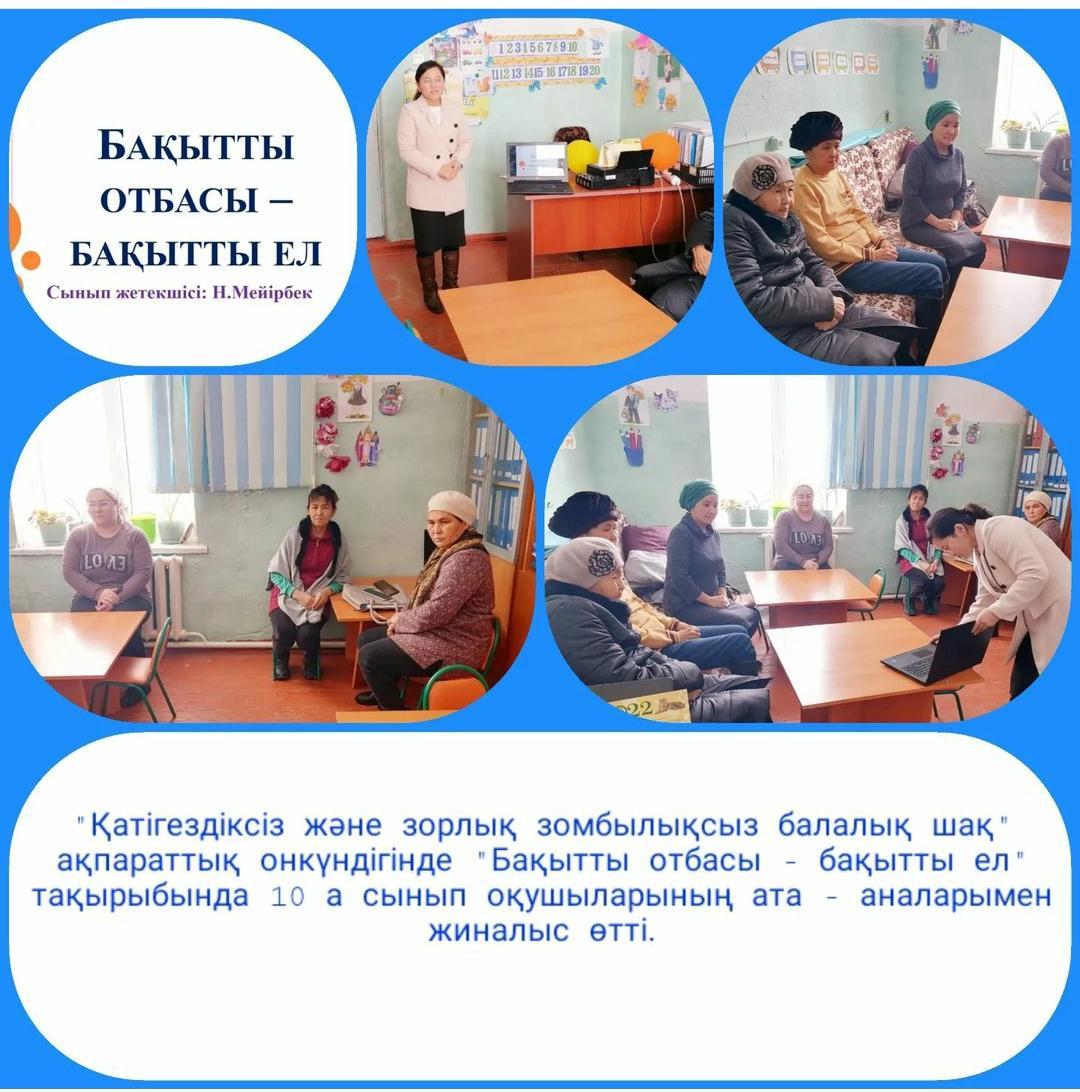 2022-2023 оқу жылында ғы 15 - 25 қараша аралығында "Қатігездіксіз және зорлық зомбылықсыз балалық шақ" ақпараттық онкүндігінде "Саналы ата-аналар" тақырыбында оқушылардың ата - аналарымен жиналыстар өтті.